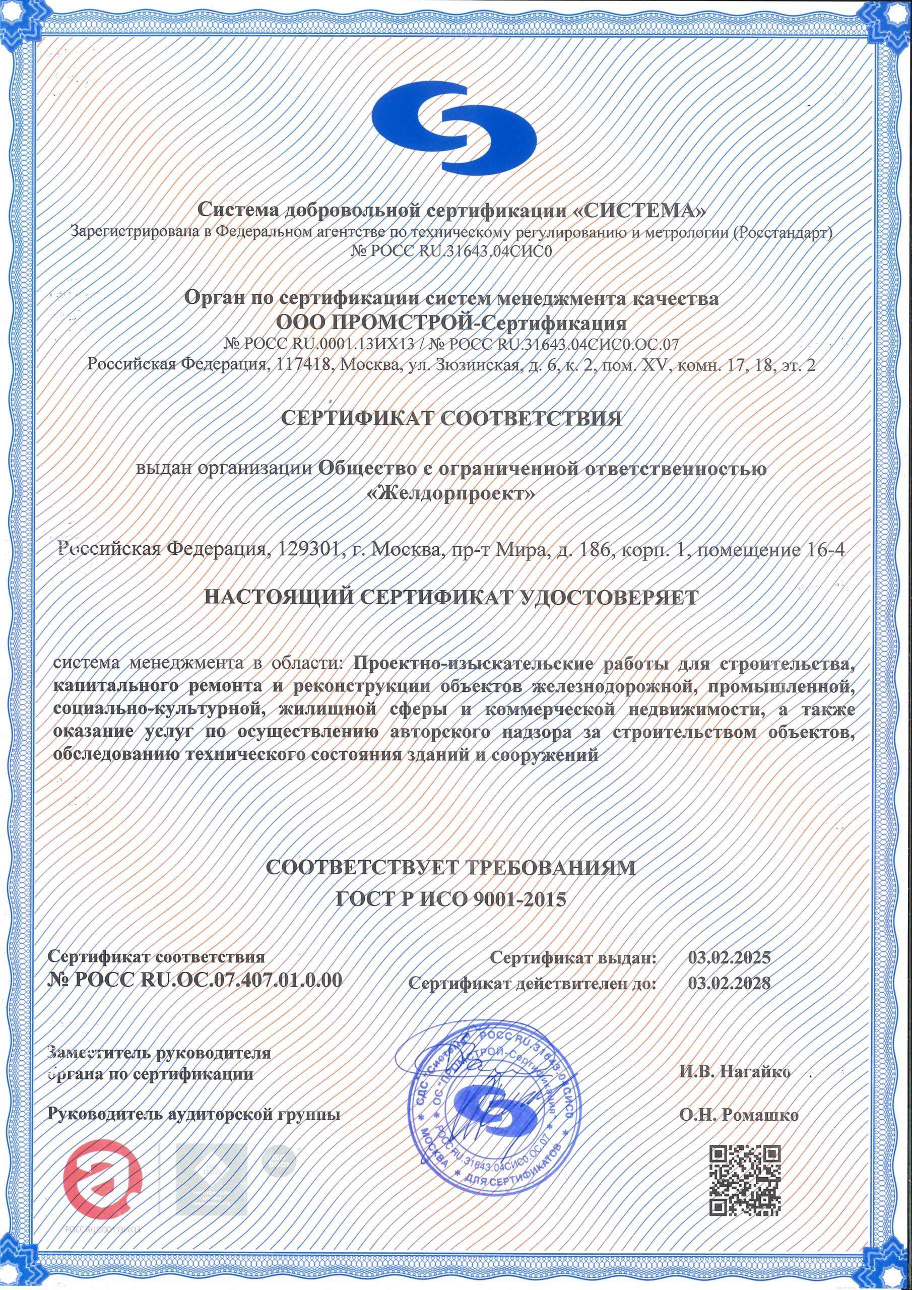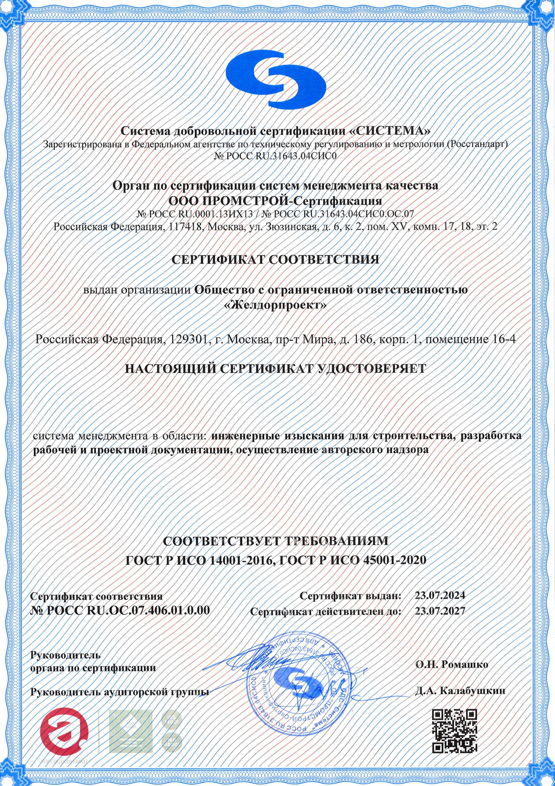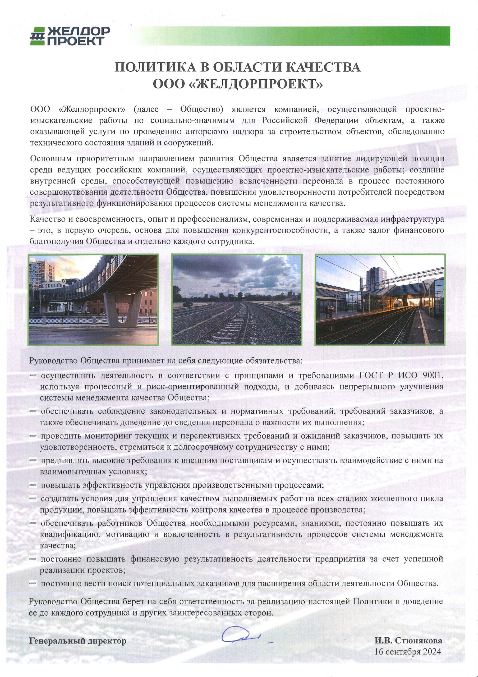 Ниже представлены сертификаты, лицензии и свидетельства, на основе которых «Желдорпроект» имеет право осуществлять проектно-изыскательские работы, а также политика в области качества.