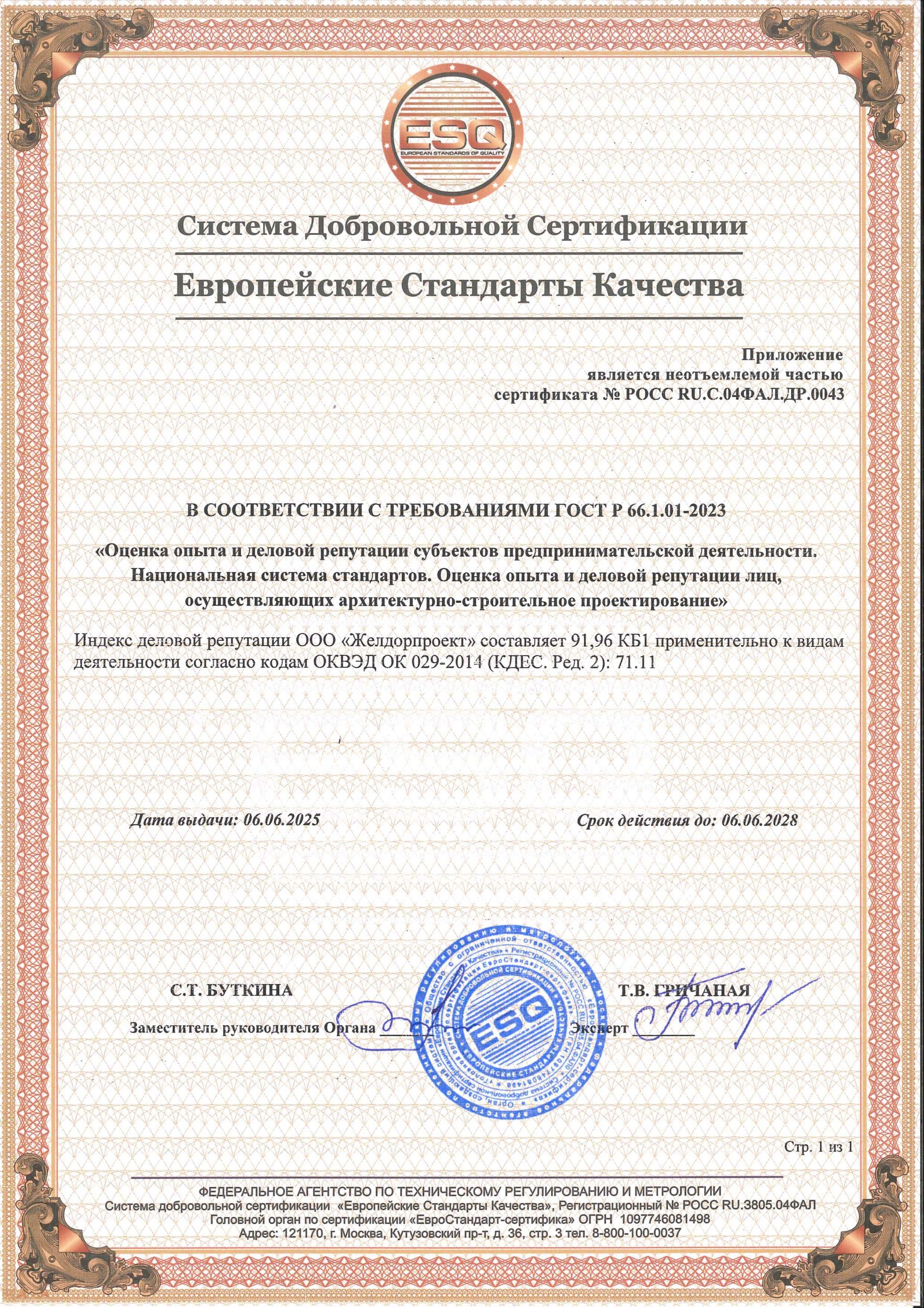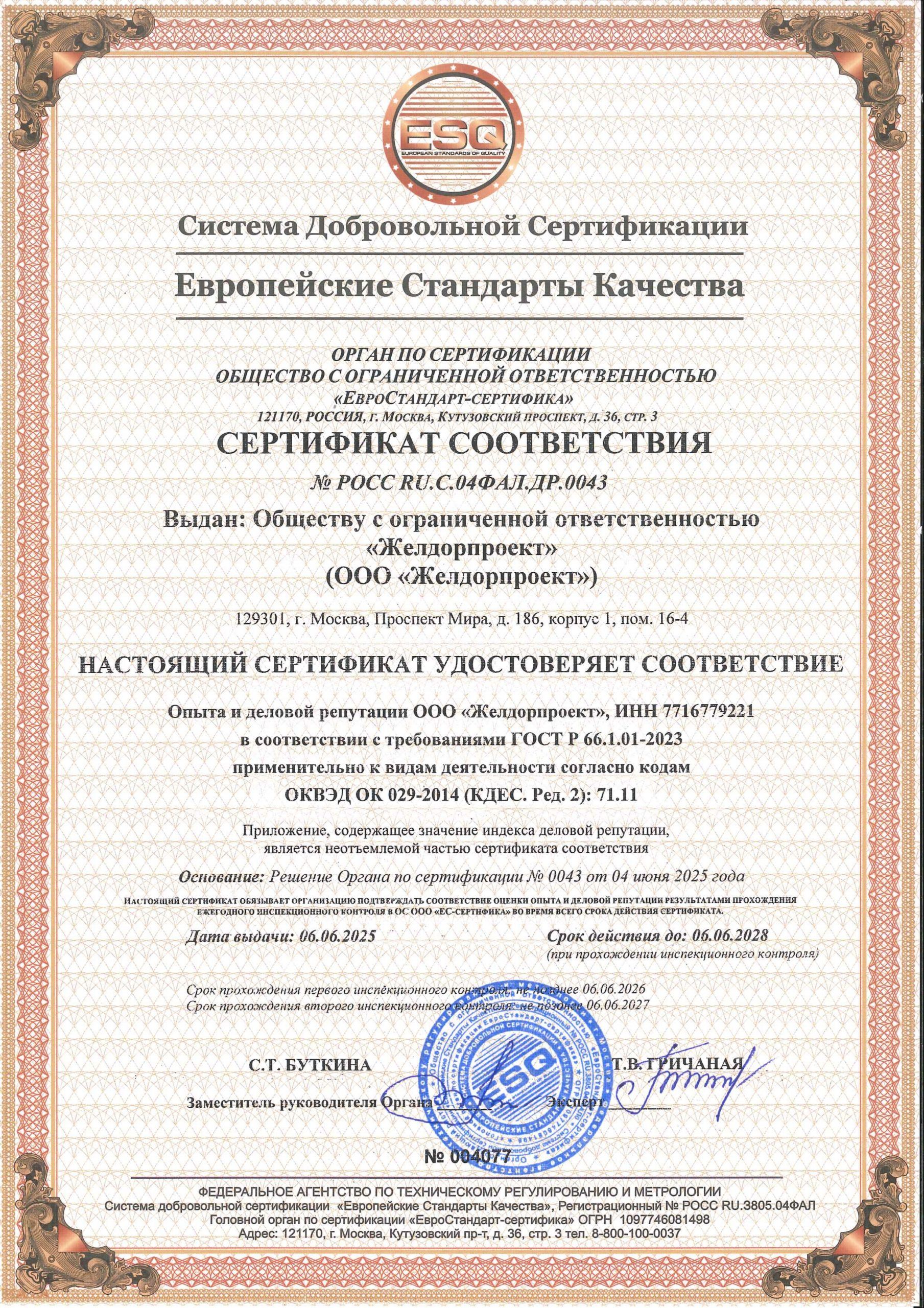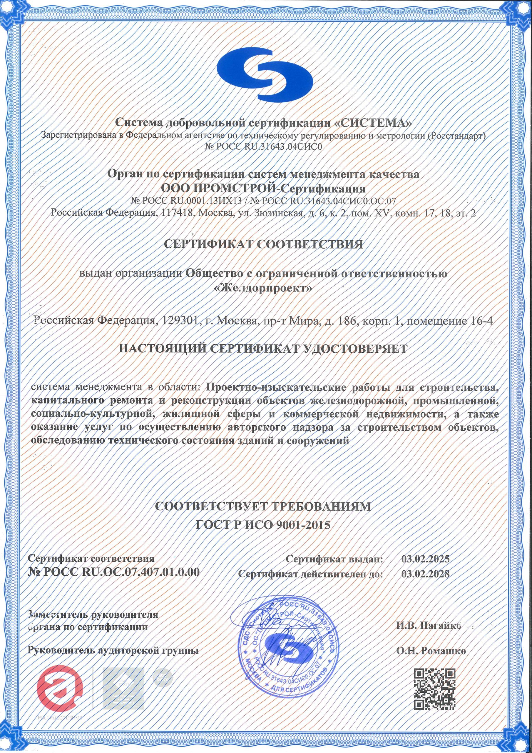 Ниже представлены сертификаты, лицензии и свидетельства, на основе которых «Желдорпроект» имеет право осуществлять проектно-изыскательские работы, а также политика в области качества.